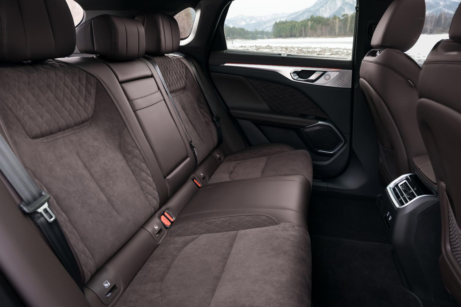ДВС 2.0 л (150 л.с.) используется как генератор с двумя электромоторами. Комбинированная мощность – 421 л.с. Автоматическая КПП с двойным сцеплением: плавность работы и отличная динамика. Разгон от 0 до 100 км/ч за 5.2 секунды. Крутящий момент 847 Нм. Емкость АКБ 114 Ач. Запас хода – 918 км. Зарядка до 80% за 53 минуты. Безопасность по Euro NCAP – 5 звезд.